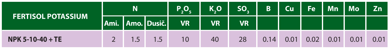Formule FERTISOL POTASSIUM jsou vyrobeny z čistých krystalů, vysoce rozpustných ve vodě a bez sodíku, chloridů a uhličitanů, a proto jsou vhodné pro všechny zavlažovací systémy. Velmi nízký obsah soli snižuje úroveň sedimentace, což zabraňuje ucpání trysek a ucpání trubek. Vysoký obsah potaše se doporučuje pro násadu a zrání plodů, kdy je pro zlepšení kvality výnosu vyžadována vyšší hladina draslíku. Obsah dusíku v jeho různých formách představuje snadno mobilní a dlouhotrvající výživu pro udržení energické rostliny s aktivovaným metabolismem pro zdravý růst všech rostlinných orgánů. Přítomnost SO3 zabraňuje nedostatku síry a usnadňuje efektivní příjem a asimilaci živin, protože hraje roli při demobilizaci minerálních prvků v půdě. Chelátové mikroelementy EDTA dodávají složení kompletní nutriční zajištění pro podporu růstu za podmínek vysokého pH půdy a pro stimulaci biochemických interakcí a aktivaci mezi různými živinami.