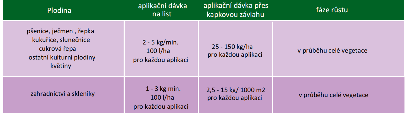 Kompatibilita: kompatibilní s většinou rozpustných hnojiv, každém případě se doporučuje provést předběžný test